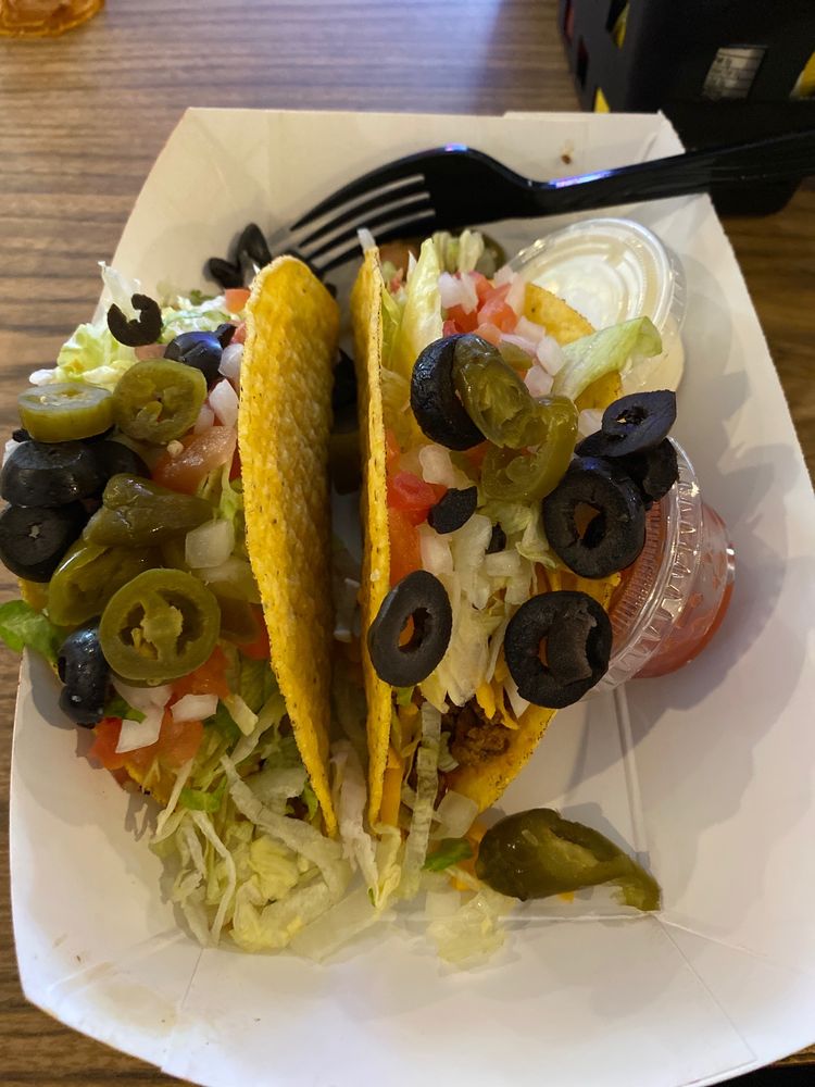 Ground beef, lettuce, tomato, onion, black olives, jalapenos, sour cream and salsa.